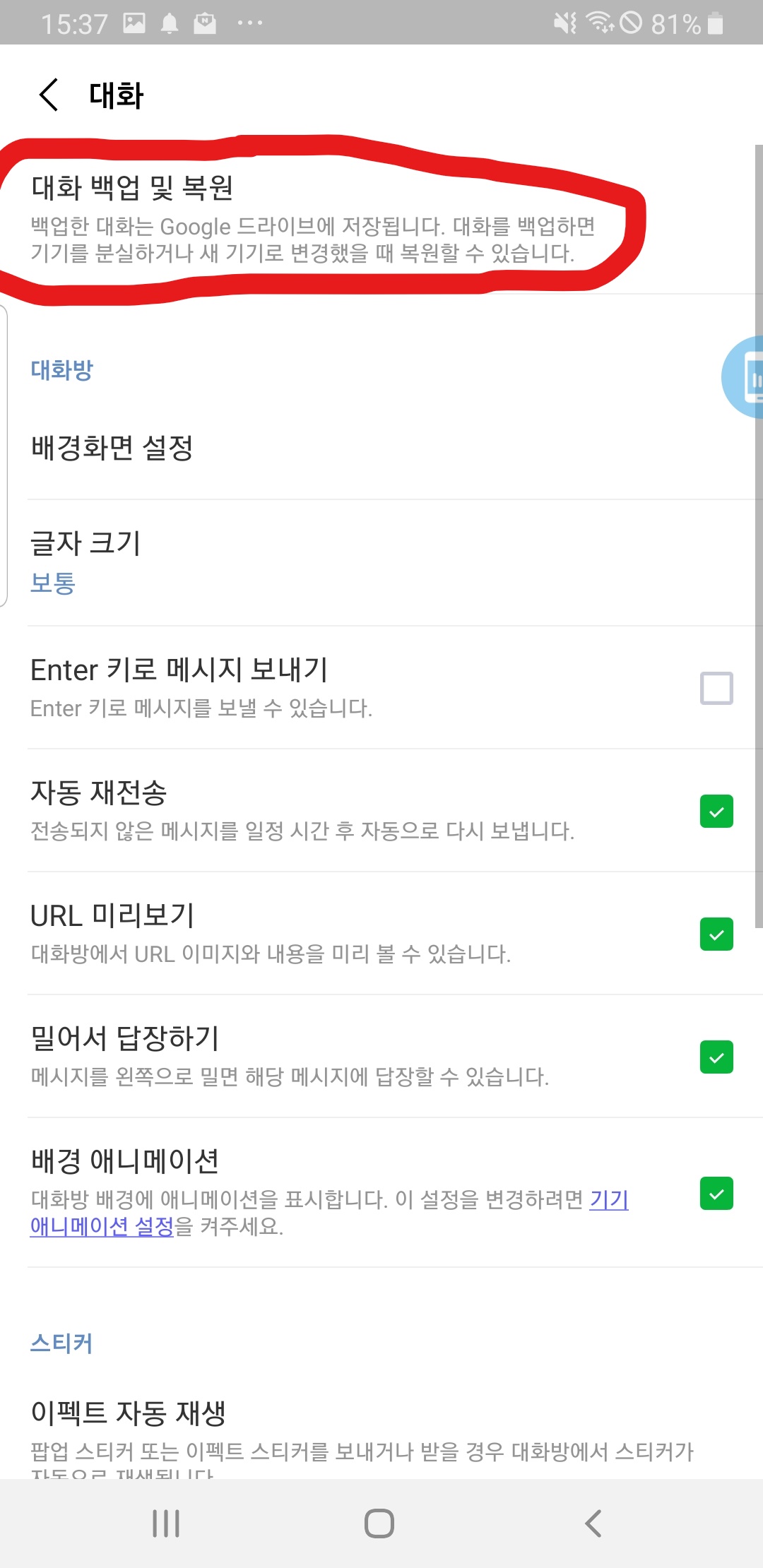 그다음 상단에 있는 "대화 백업 및 복원"을 눌러주시면 됩니다.