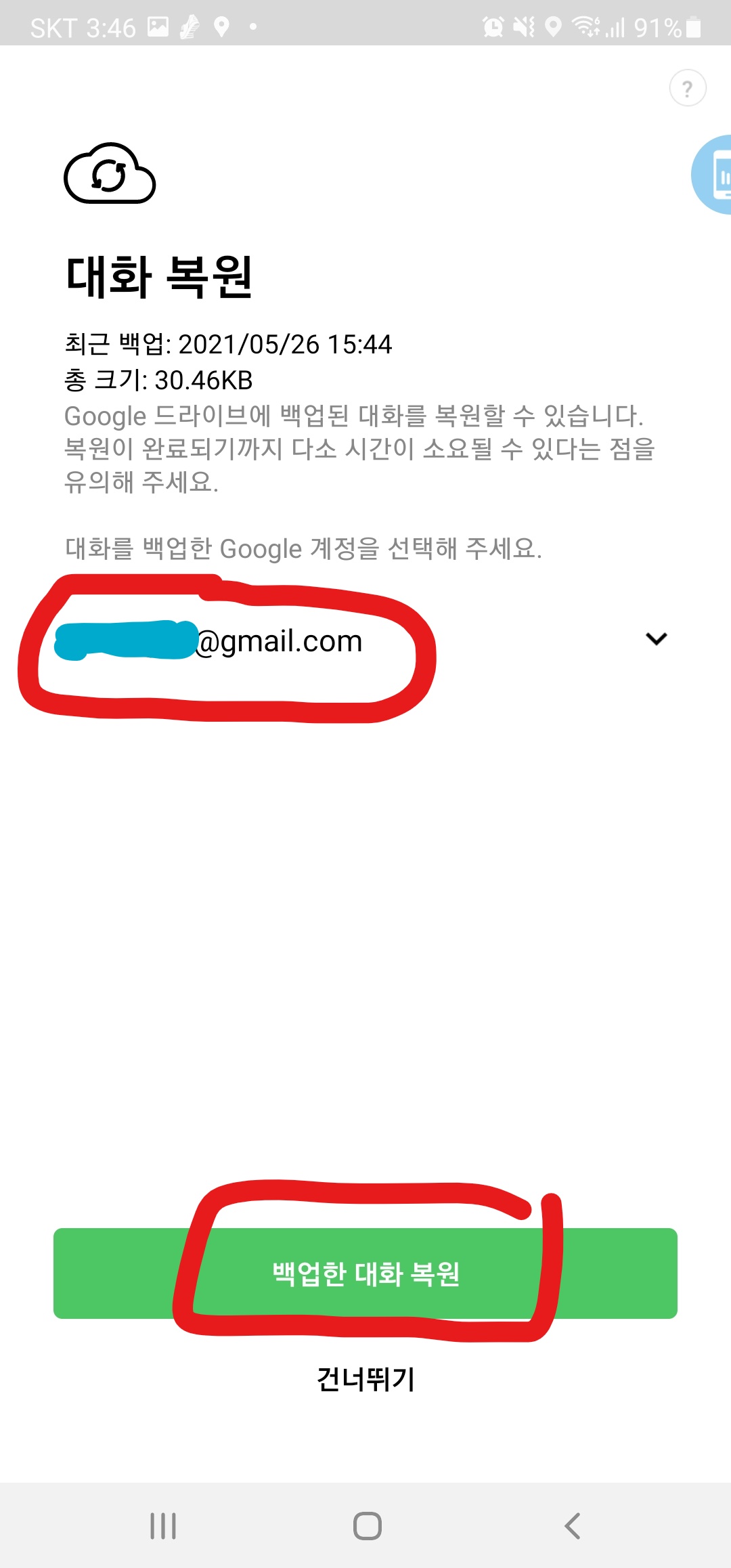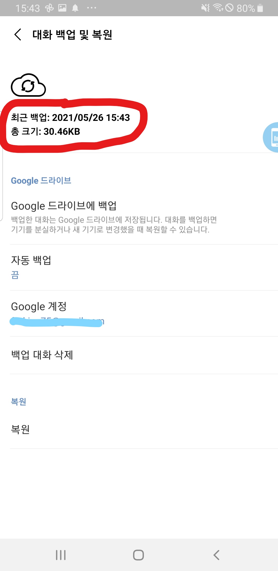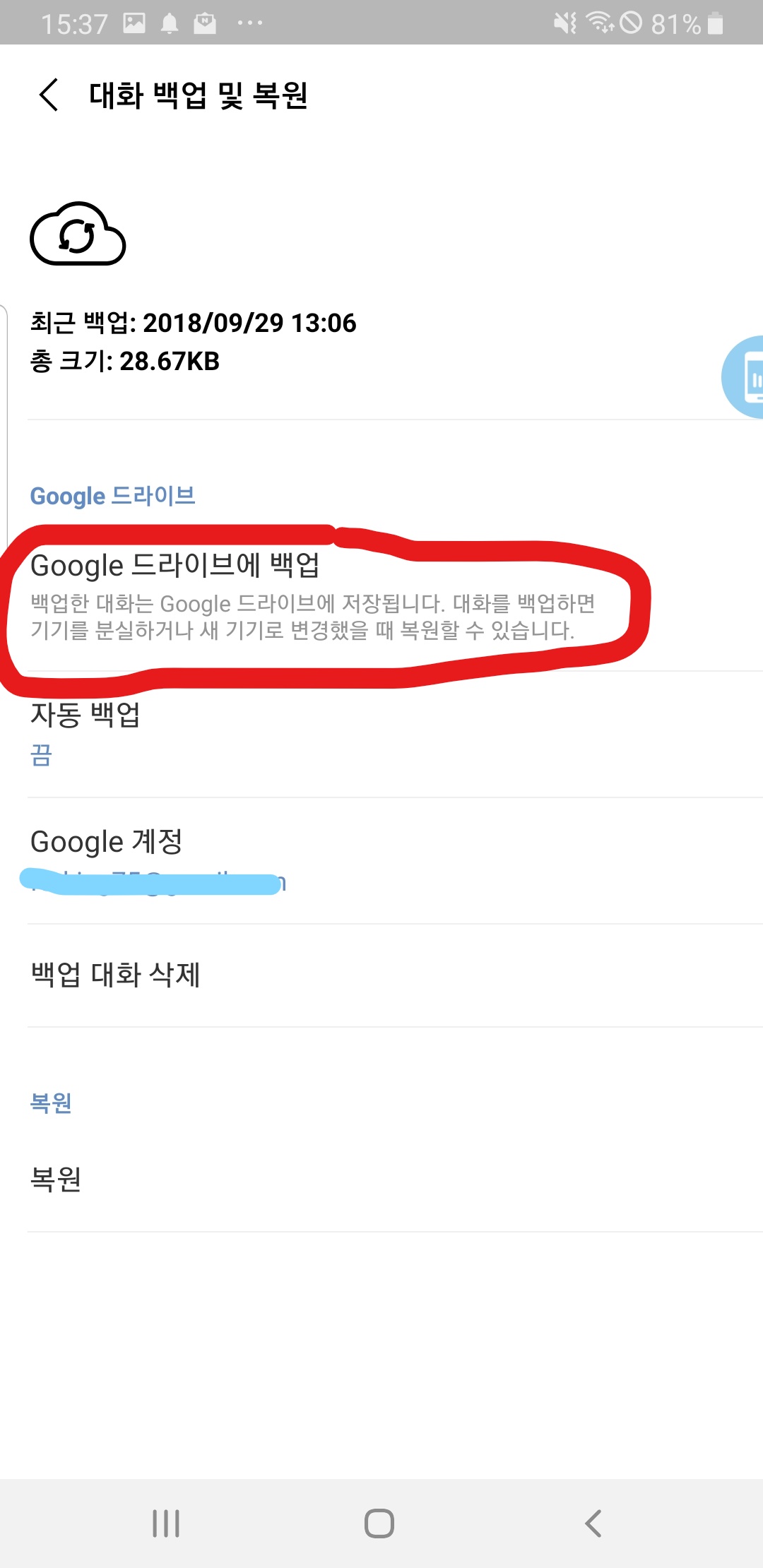 위에 보이시는 "Google 드라이브에 백업"을 누르시면,