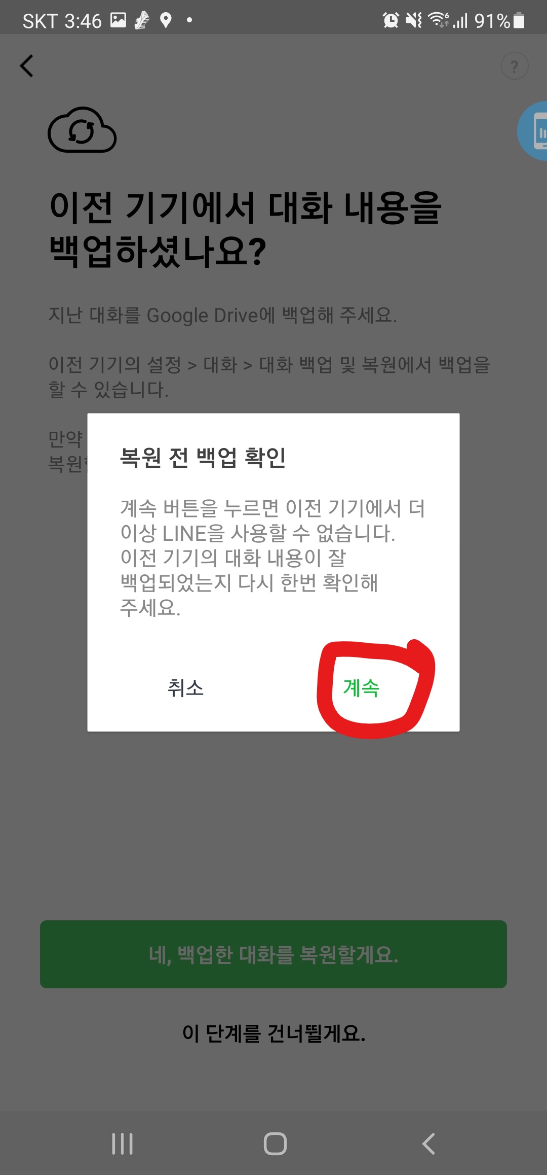 위 사진처럼 이전 기기에서의 대화 내용을 백업할지 알림 창이 뜨게 됩니다.