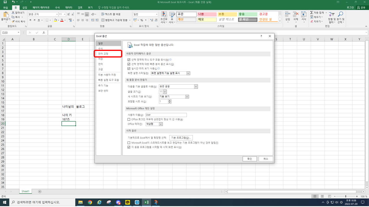 바로 excel 옵션이 나옵니다.