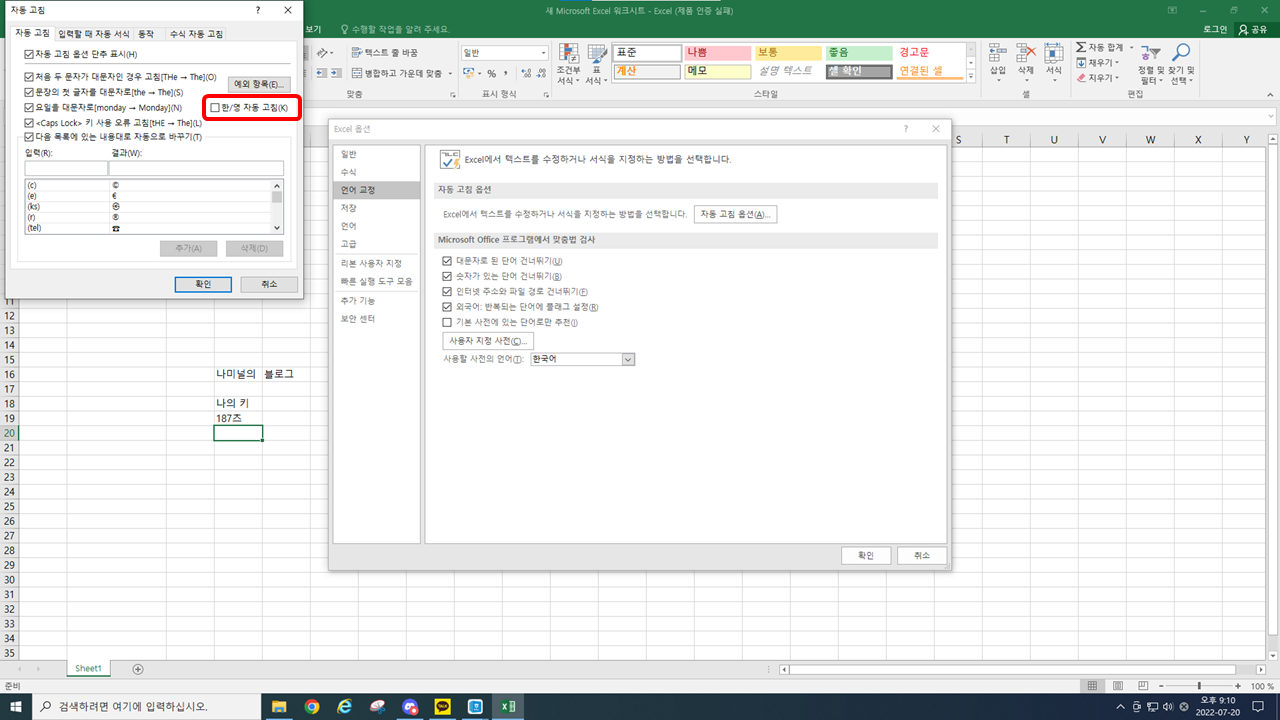 "엑셀 영어 자동 수정 끄는 방법"입니다.>︿<
