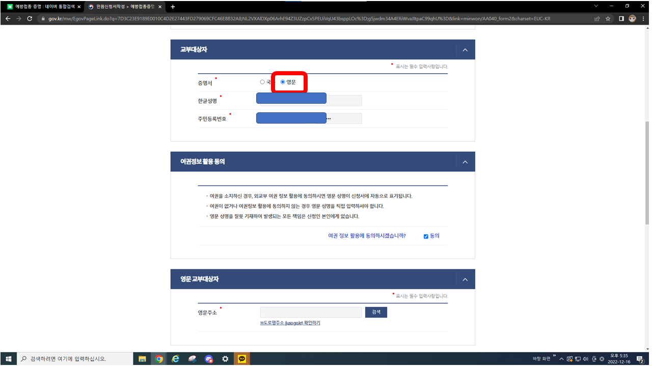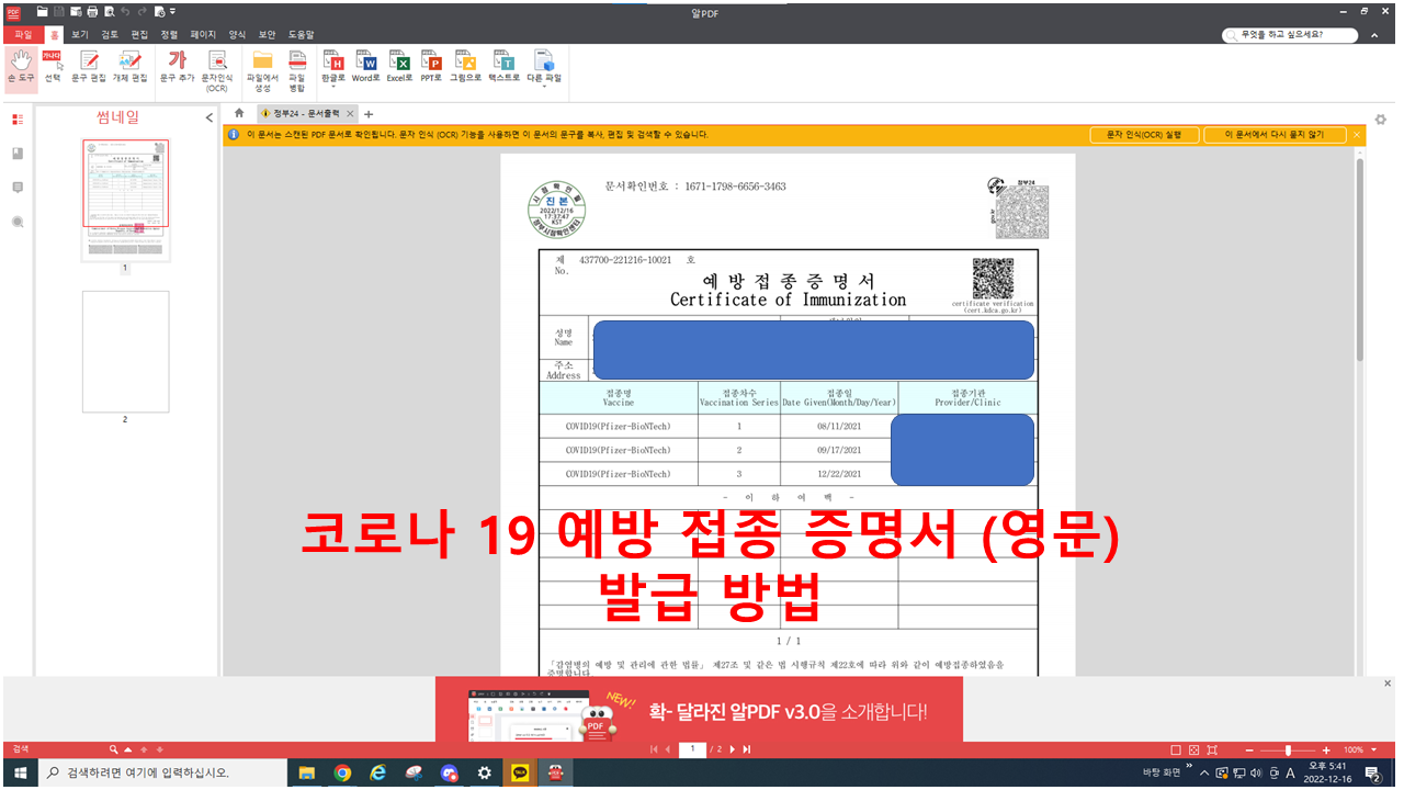 여기에 필요한 것이 바로 "코로나 19 예방 접종 증명서 (영문)"입니다.