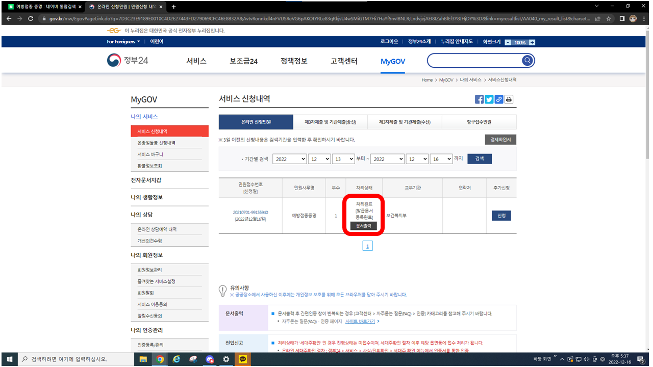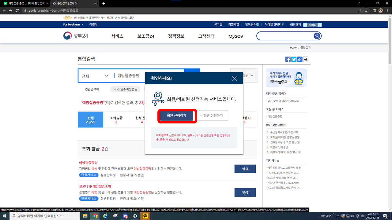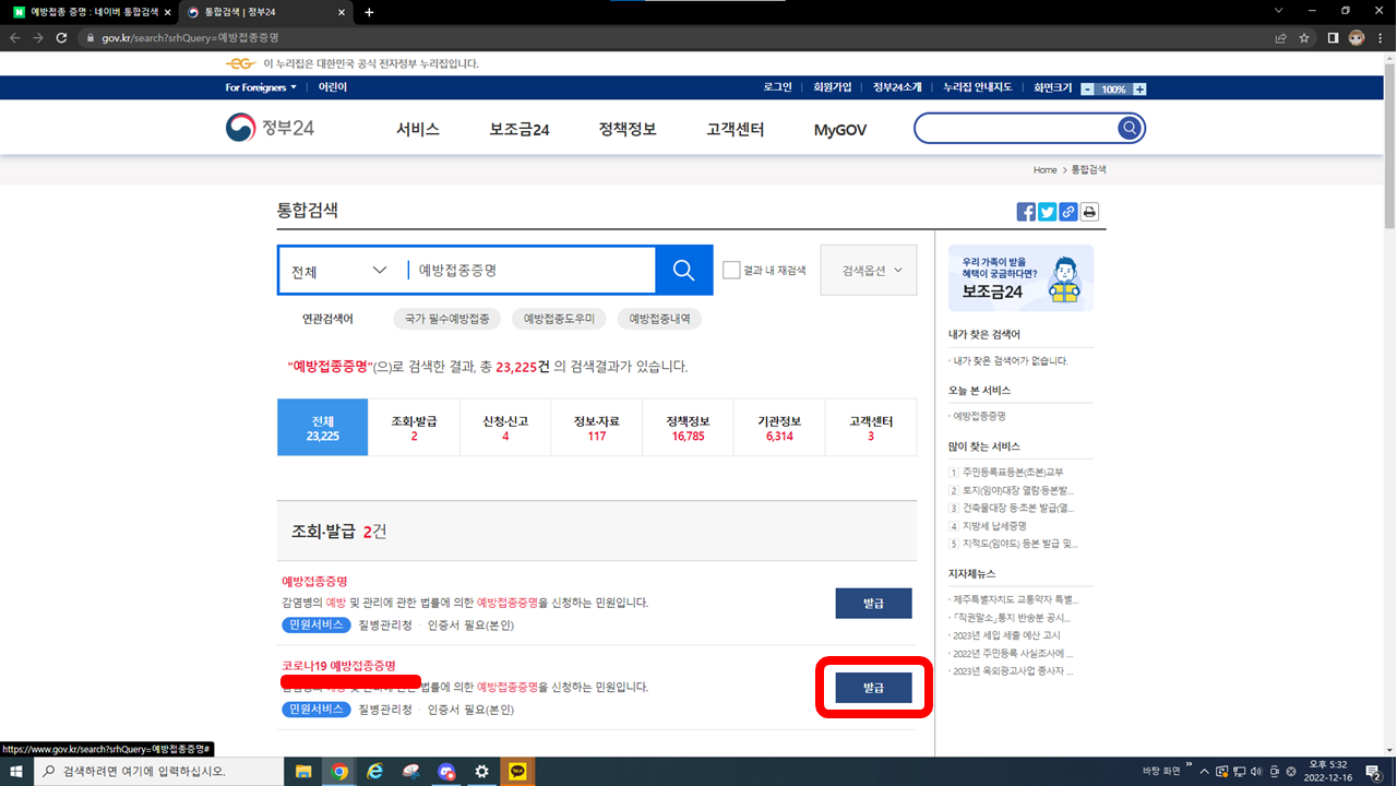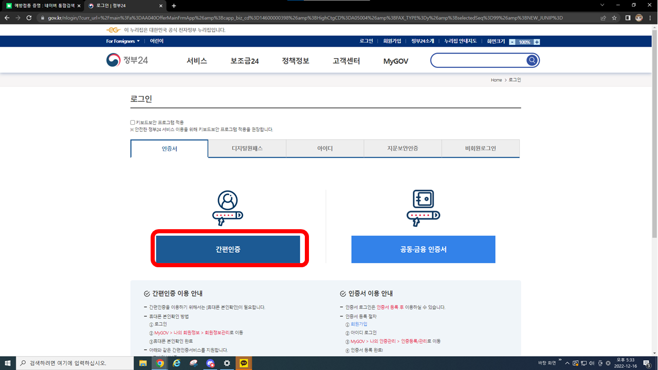 어디서든 검색을 하시면 위처럼 "예방접종증명서 바로가기 - 정부 24"가 나오는데