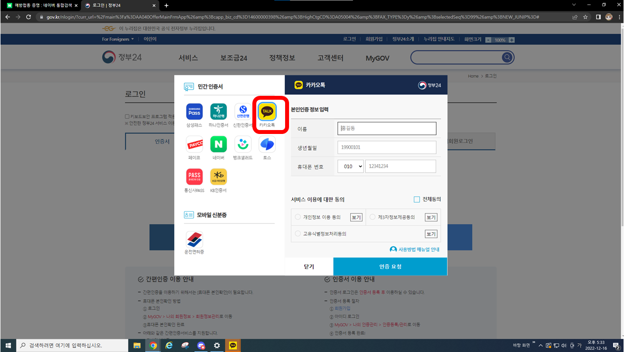 간편 인증을 누르고 카카오톡 또는 편하신 방법으로 본인인증을 해주시면 바로 로그인이 됩니다.