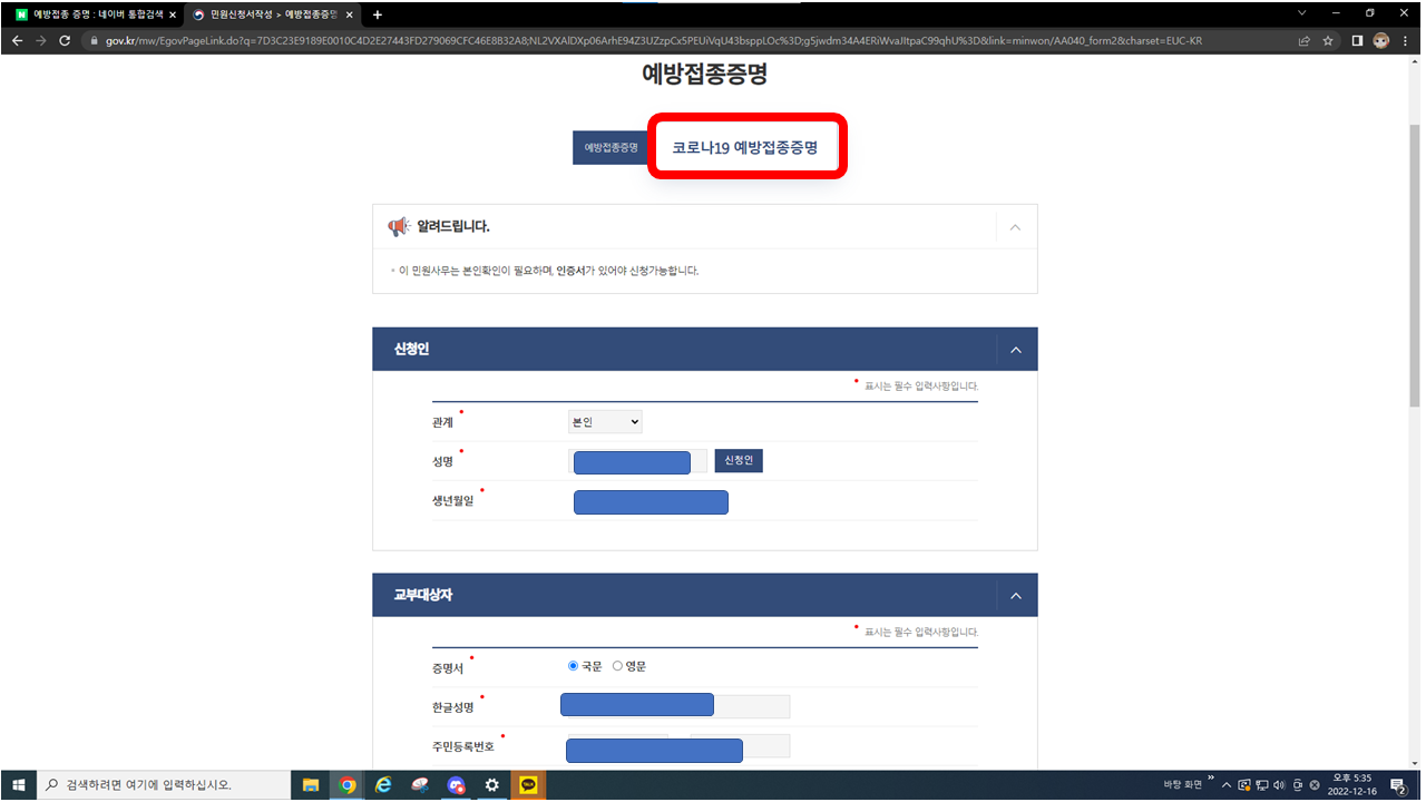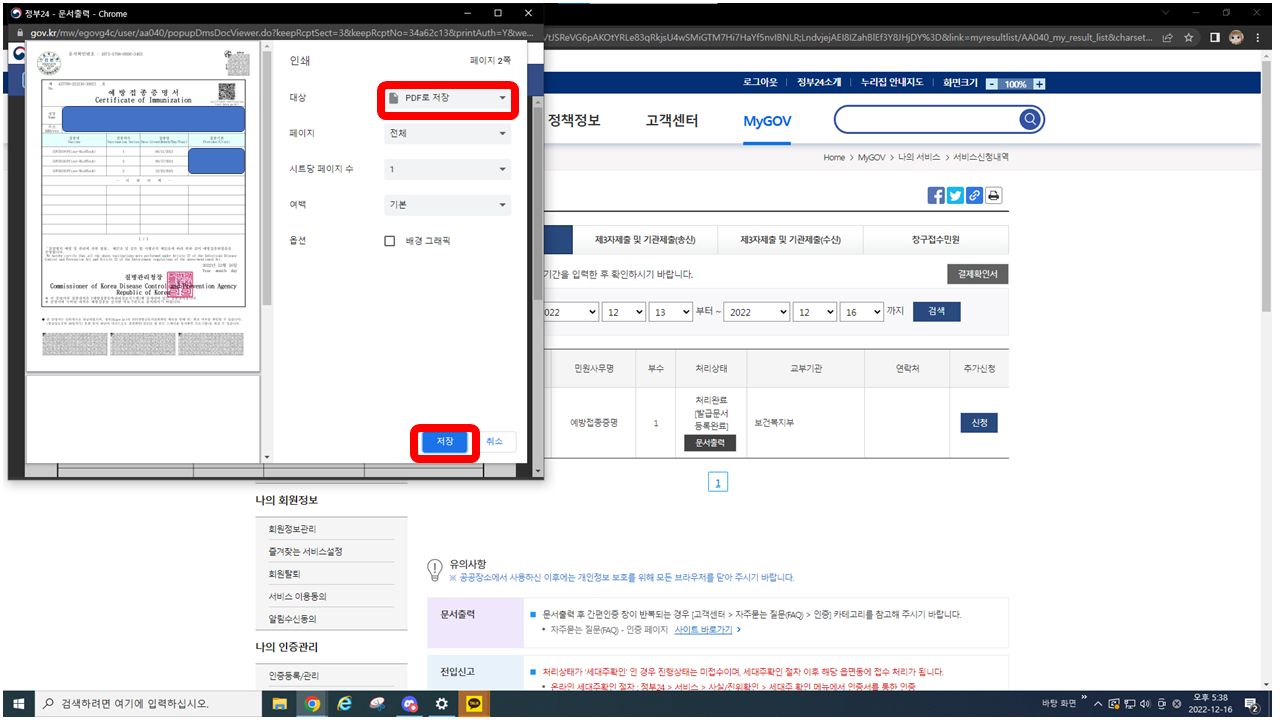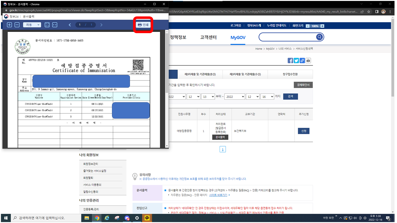 이제 저희는 코로나 19 예방접종 증명서를 출력해야 하므로