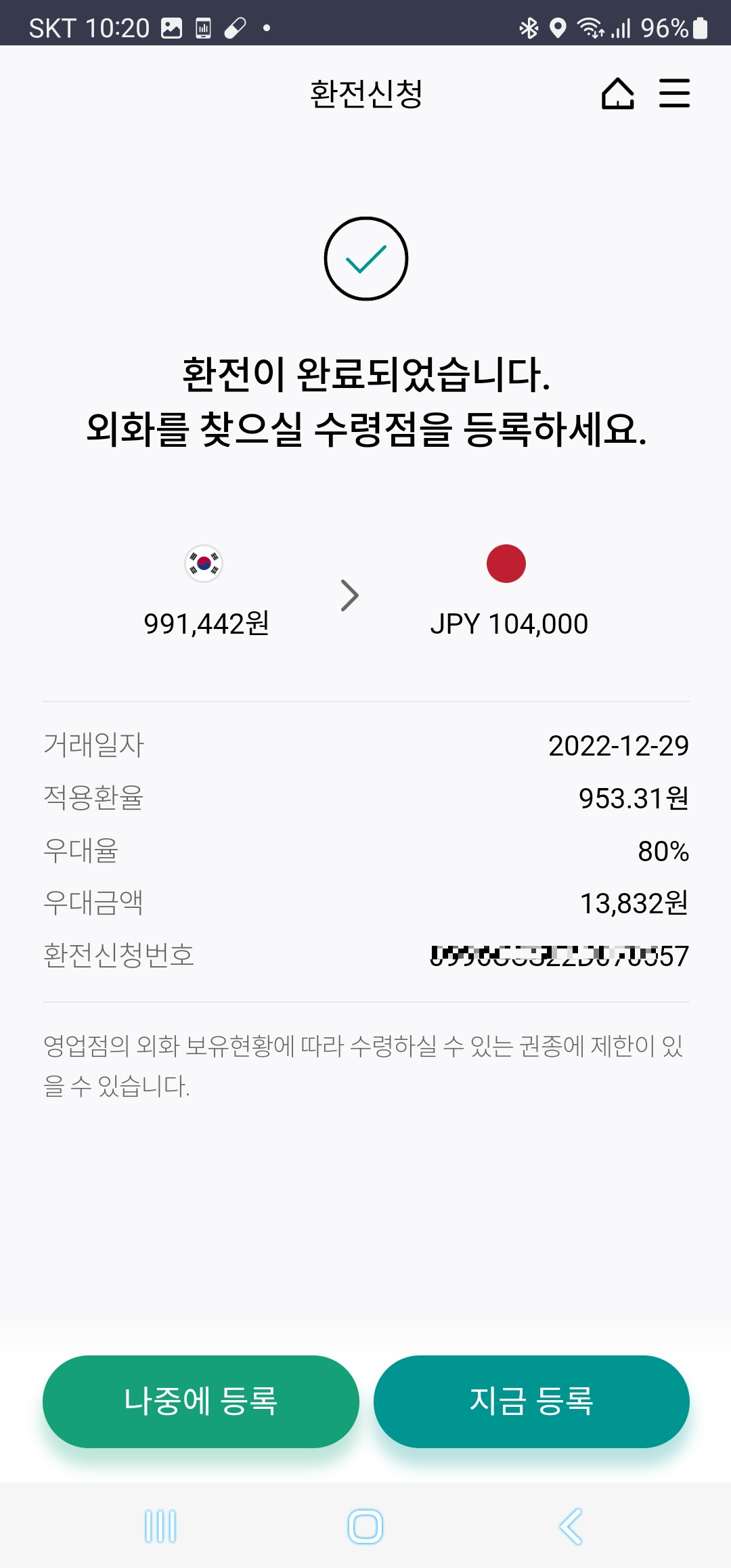 총 환전액과 환율, 우대율과 우대금액을 보실 수 있습니다.